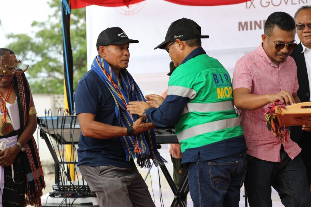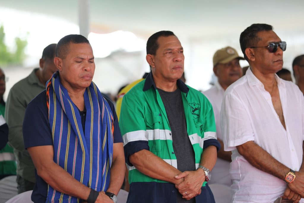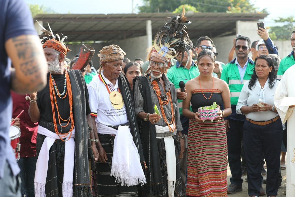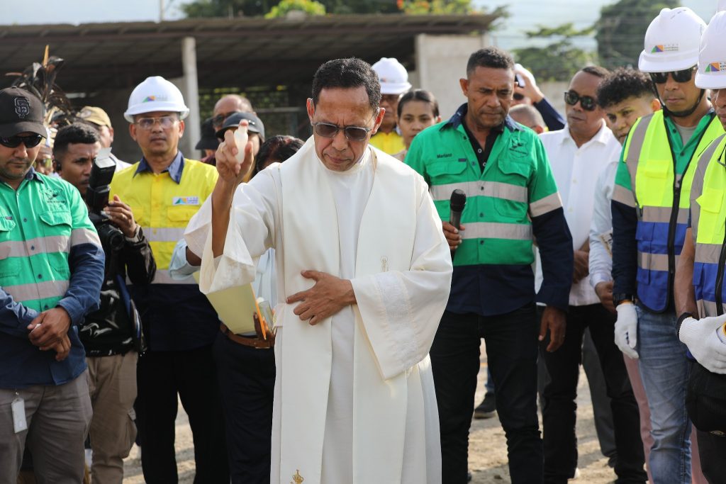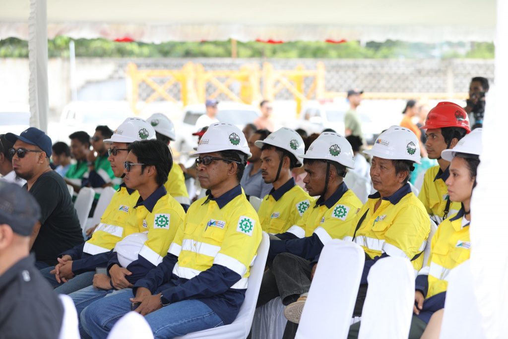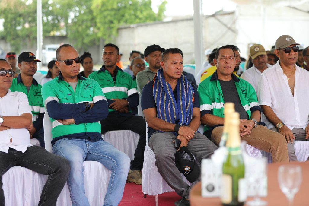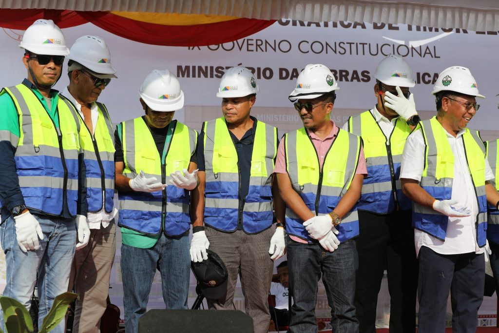 Prezidente Autoridade Munisรญpiu (PAM ) Dรญli,Sr. Francisco dos Santos hamutuk ho Ministru Obras Pรบblikas (MOP), S.E. Samuel Marรงal, Vice Ministru Infraestrutura, S.E. Jรบlio do Carmo, Secretรกriu Estadu Eletrisidade รgua no Sanementu, S.E. Santos Noronha, Prezidente BTL, Prezidente Eletrisidade, Rep. CNA, Diretor Gerais no Nasionais, Xefe Suku, Diretor Kompaรฑia Nusa Konstruction Enginering, halaโo seremรณnia tau fatuk dahuluk (primeira pedra) ba konstrusaun edifรญsiu foun Ministรฉriu Obras Pรบblikas (MOP) nian.